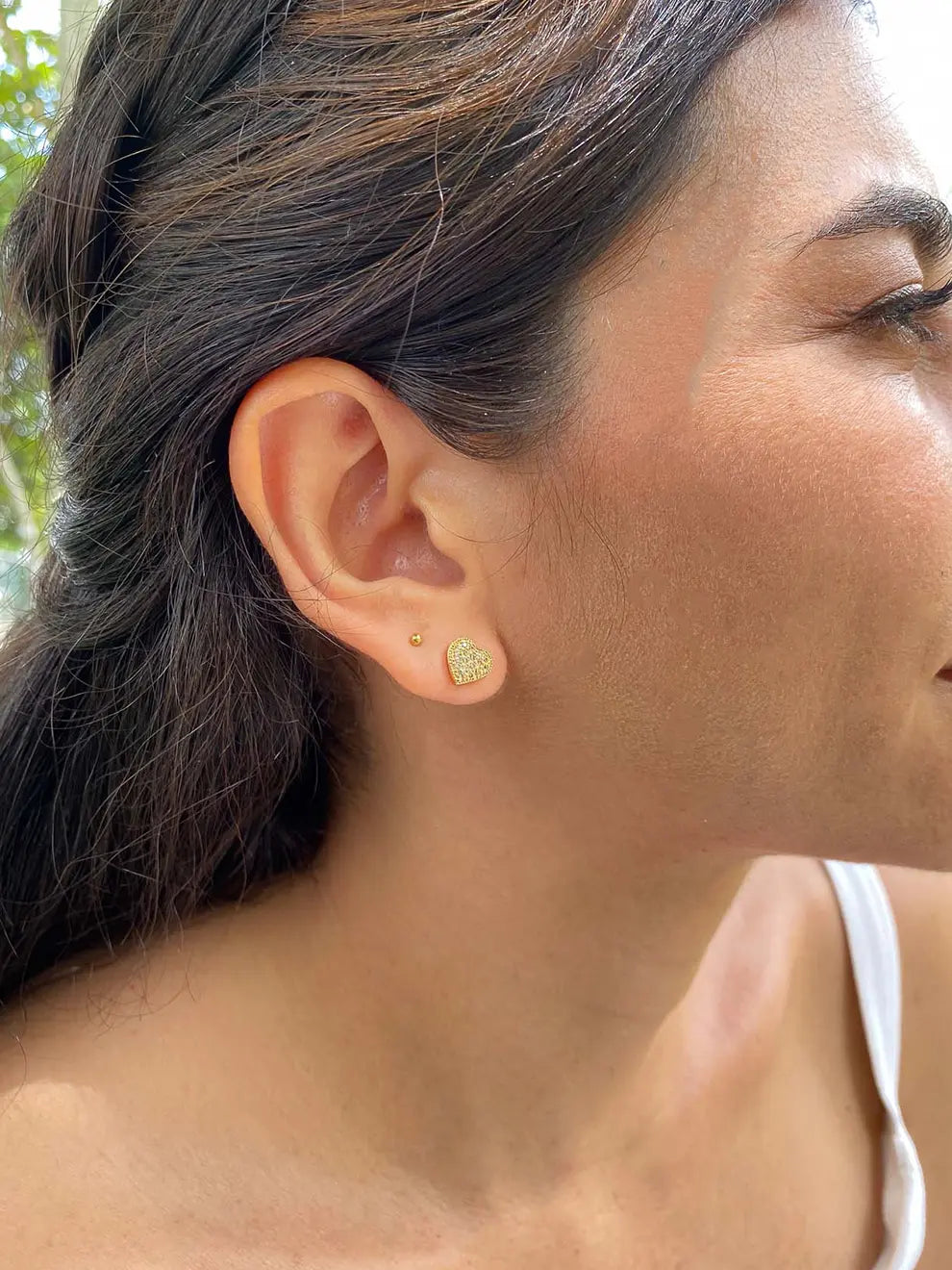 Románticos y versátiles. Aretes tipo topo en rodio con microcircones que cubren la superficie del corazón para un efecto de brillo continuo. Su tamaño mini los hace ideales para uso diario; se ven pulcros en el lóbulo y combinan con cualquier estilo. Cierre mariposa seguro, acabado prolijo y un destello que resalta rasgos sin recargar. Van perfectos del trabajo a la cena.