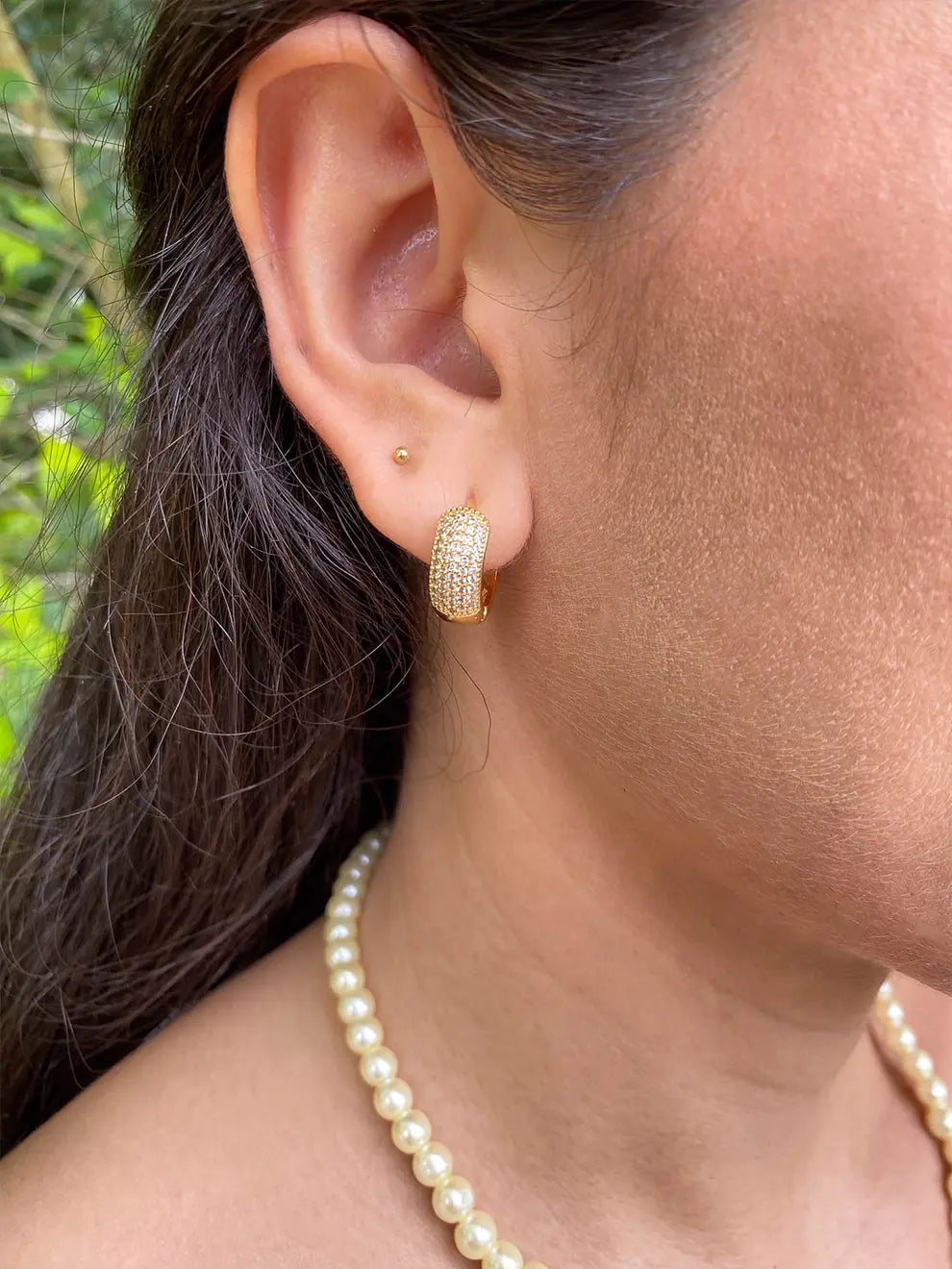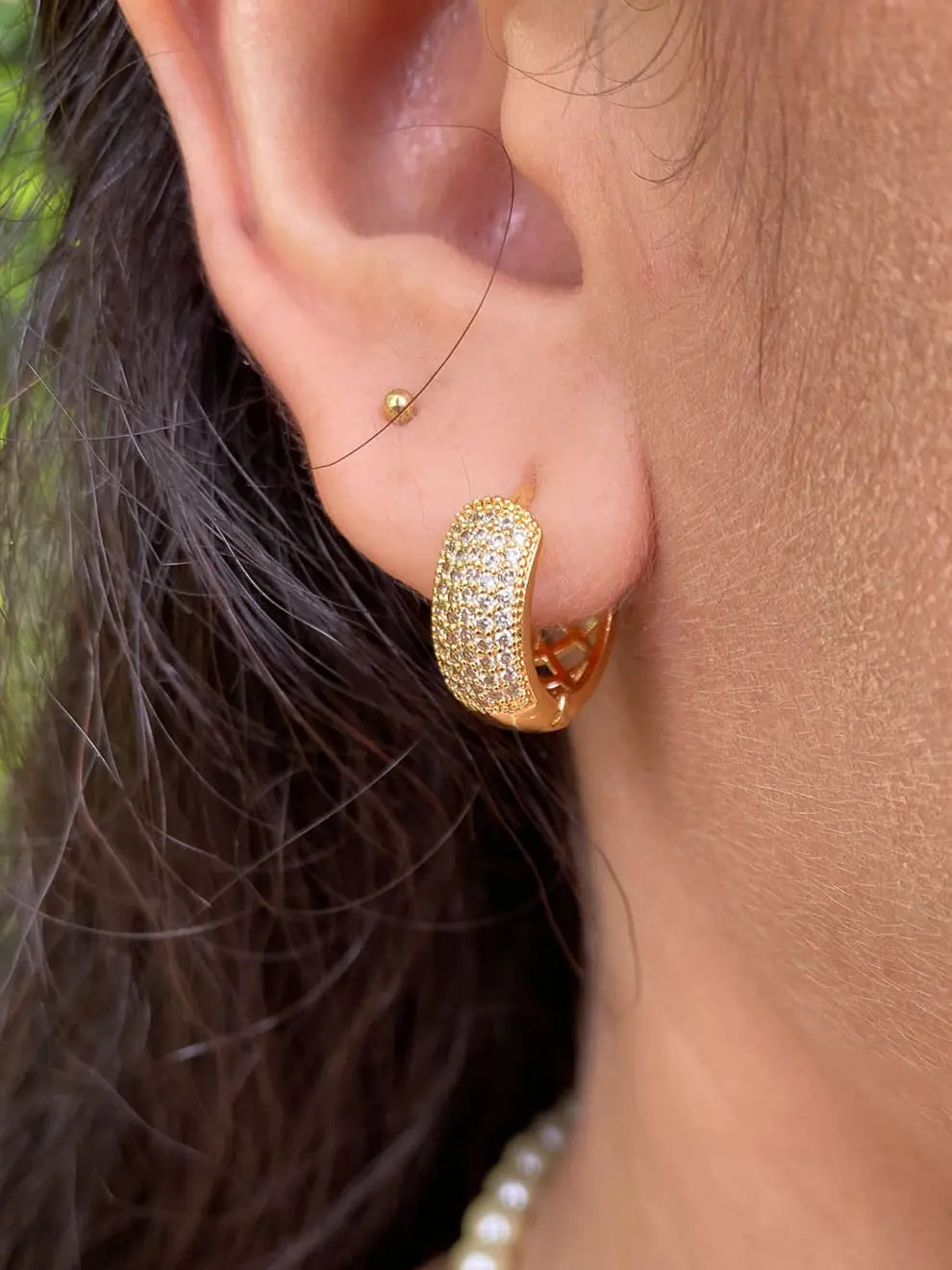 Un brillo que abraza el lóbulo. Estos aretes tipo huggie en acabado rodio dorado llevan la superficie tapizada de microcircones, logrando un destello uniforme que ilumina el rostro. Su perfil ancho aporta presencia sin perder la delicadeza; al quedar pegados a la oreja estilizan y se sienten cómodos todo el día. Cuentan con cierre a presión para poner y quitar fácil, y una terminación pulcra que eleva desde una camiseta blanca hasta un vestido satinado. Un básico elegante que no falla.