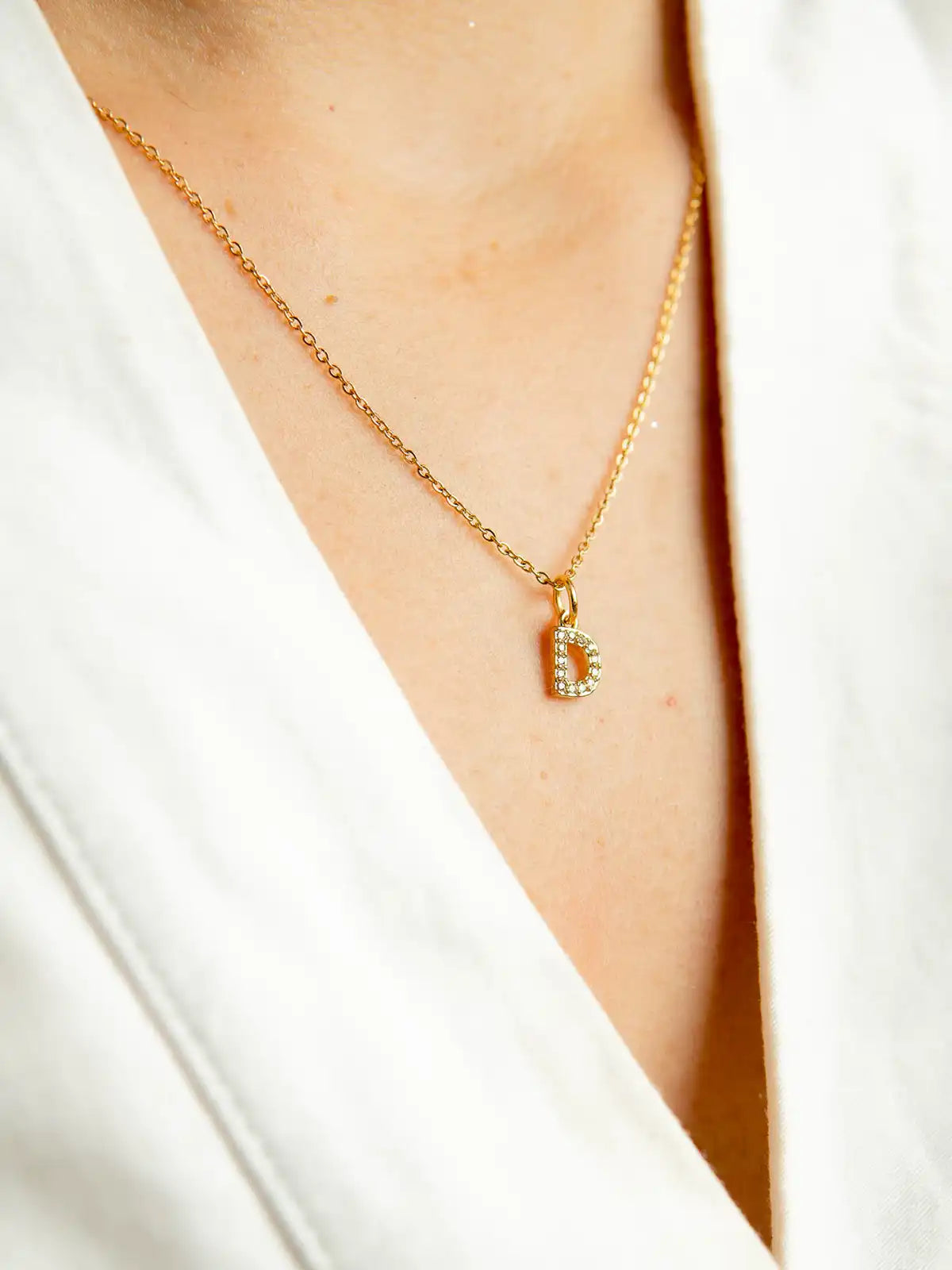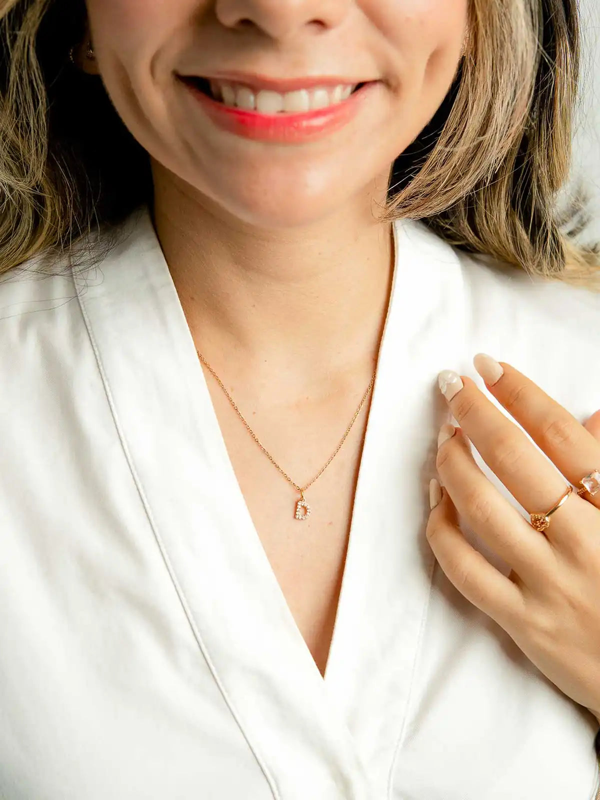 Este delicado collar con inicial personalizada es perfecto para darle un toque único y especial a tu estilo. Fabricada en cadena de acero y letra en rodio con un acabado dorado brillante y decorado con cristales que capturan la luz de manera sutil, este accesorio es ideal para quienes buscan algo elegante y significativo. La letra inicial lo convierte en un detalle único, perfecto para uso diario o como un regalo inolvidable. Ligero, cómodo y fácil de combinar, este collar es la mezcla perfecta entre sofisticación y personalización.