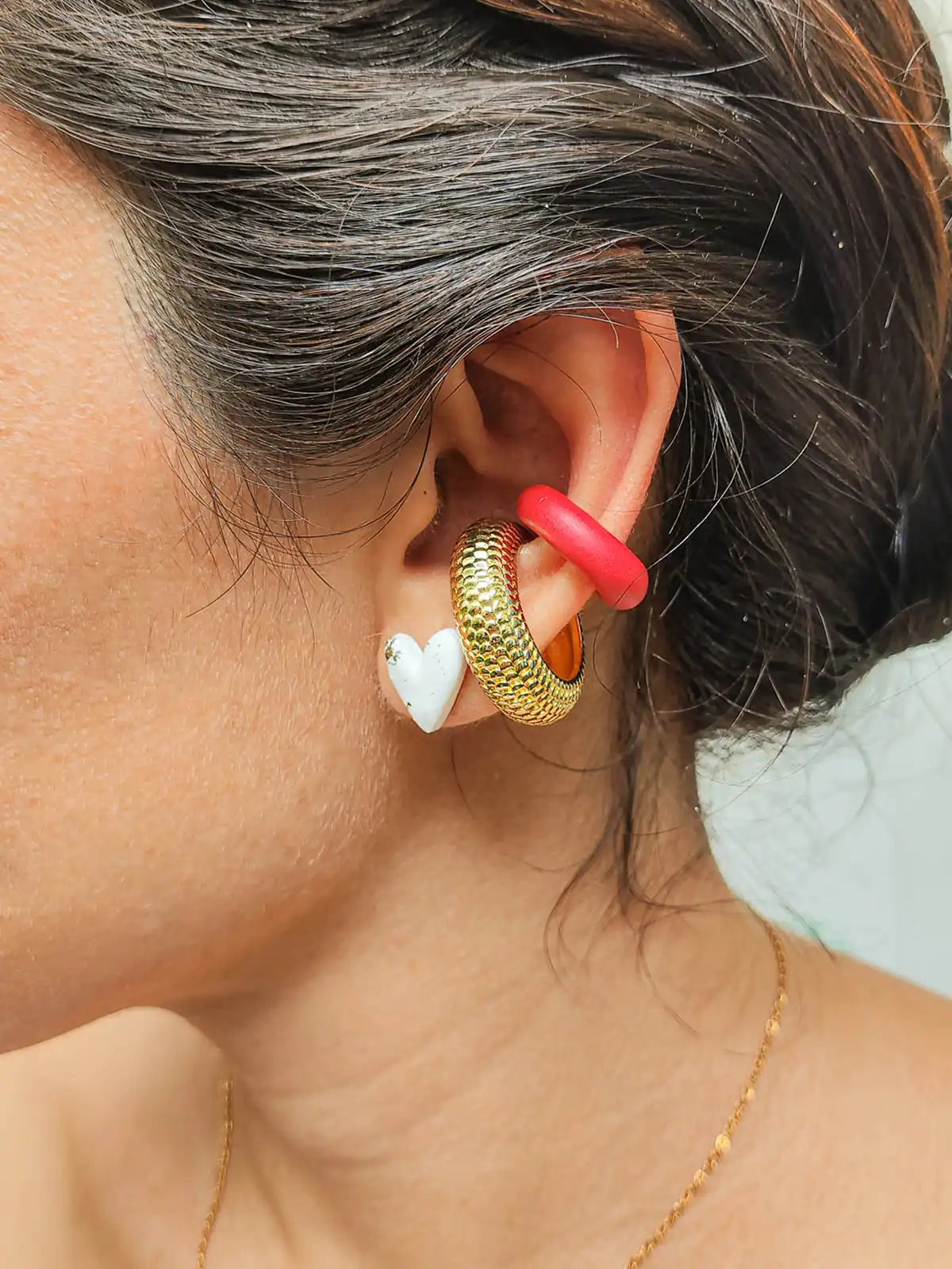 Descubre el equilibrio perfecto entre audacia y sofisticación con nuestros ear cuffs texturizados. Sin necesidad de perforaciones, su diseño envolvente y textura detallada evocan un estilo fuerte y moderno. Perfectos para elevar cualquier look con un toque de distinción y confianza. Fabricados en material hipoalergénico para un ajuste cómodo y seguro. ¡Luce una joya que refleje tu esencia única!