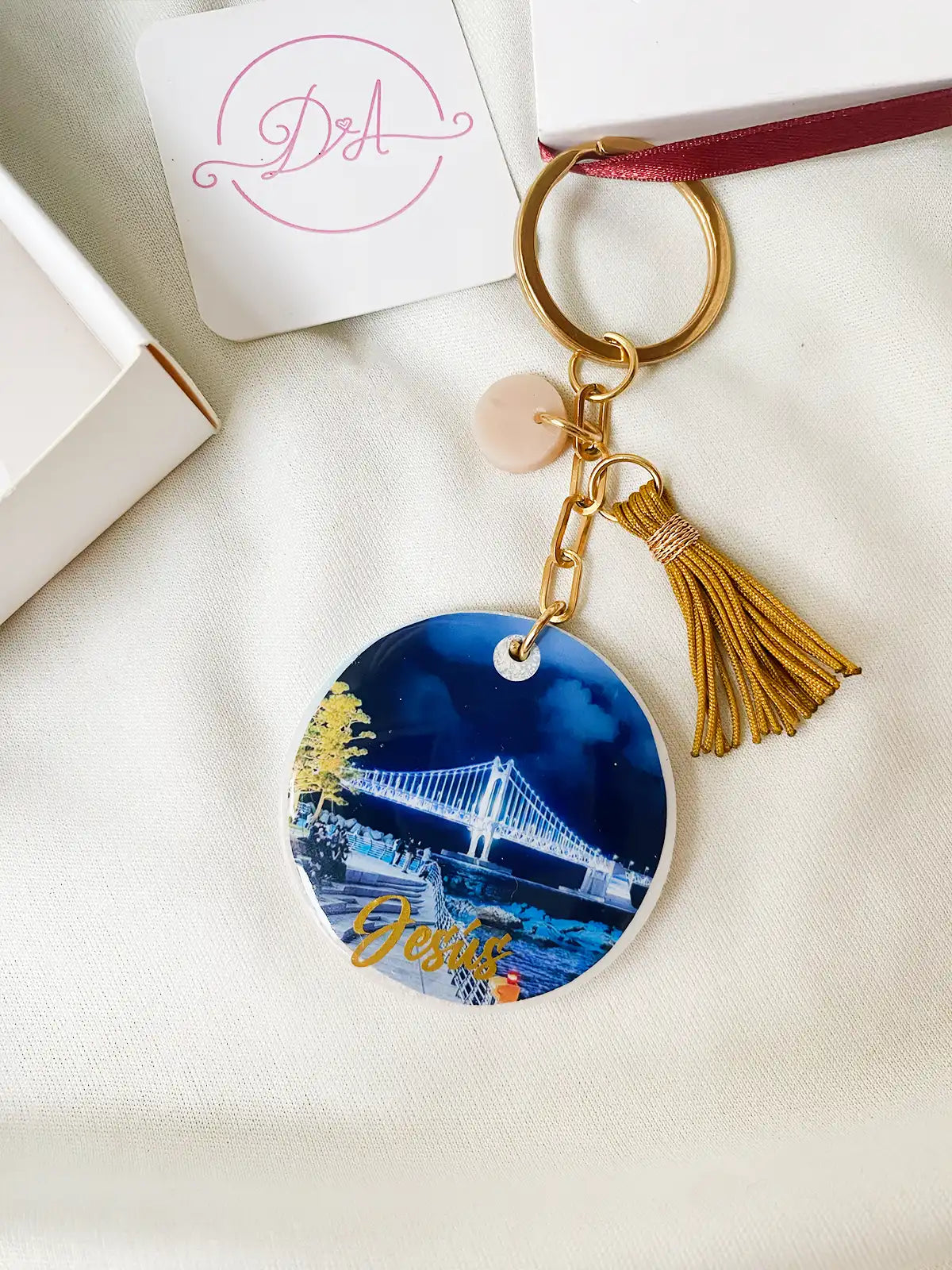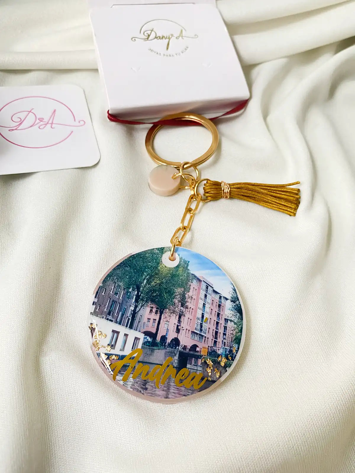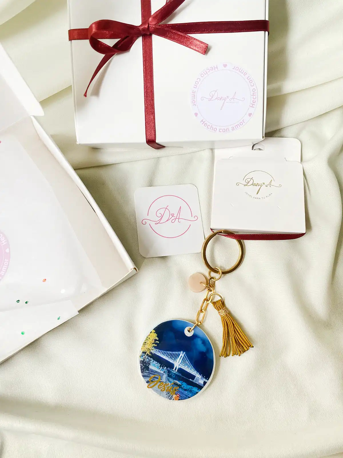 Transforma tus recuerdos en arte portátil con este llavero de resina personalizado, diseñado para destacar con imágenes, nombres o frases únicas por ambos lados. Sus detalles dorados, cadena y argollar en acero, y borlas le añaden un toque de elegancia, mientras su empaque de lujo lo convierte en el obsequio perfecto para cualquier ocasión especial.