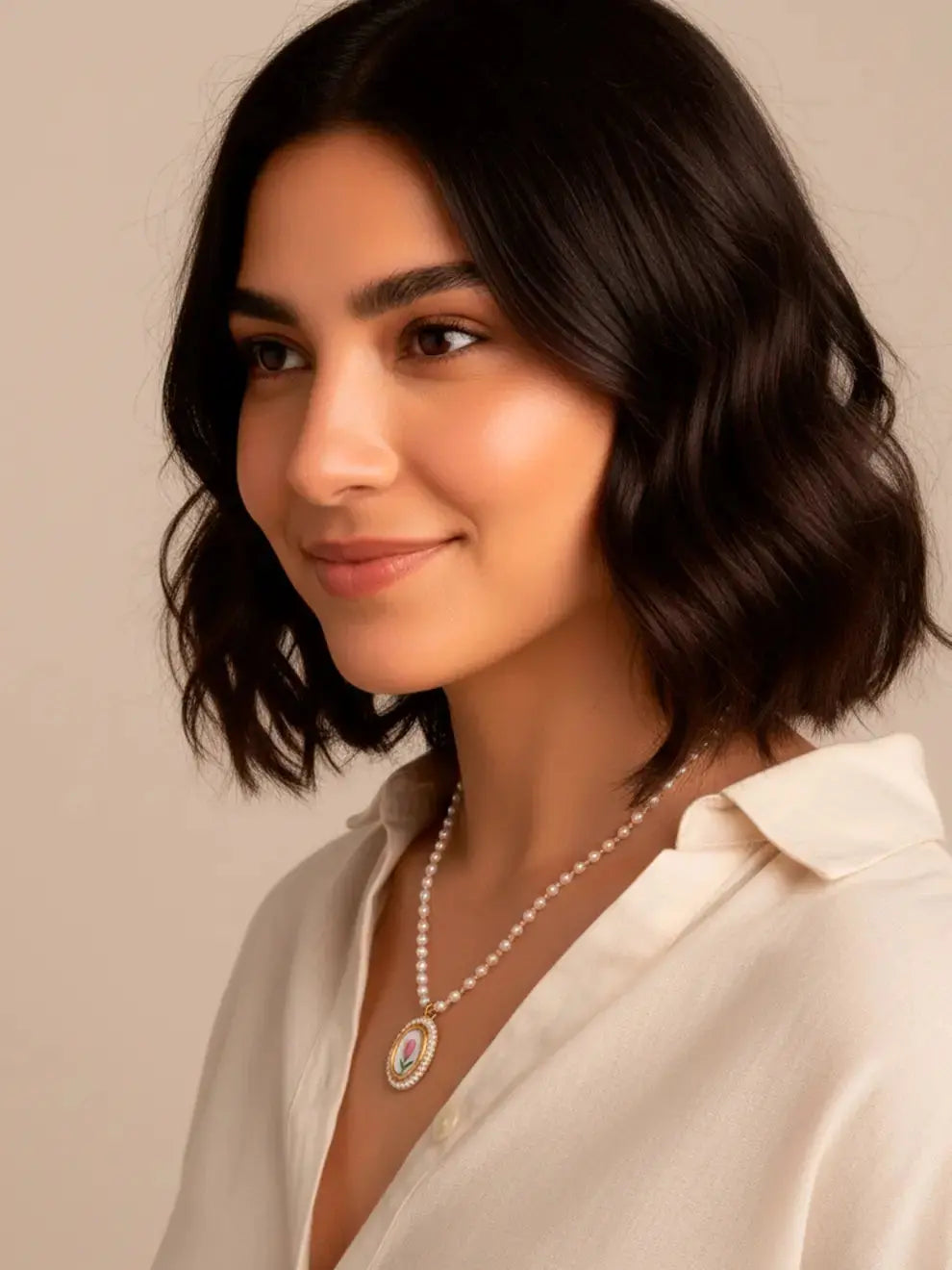 Un tulipán en miniatura que enmarca el escote con delicadeza. El dije ovalado en arcilla polimérica, bordeado por un marco dorado, cuelga de una tira de perlas de vidrio entrelazadas con cuentas cristalinas. Herrajes y extensión en acero inoxidable para un acabado pulcro y duradero. El tono rosa del tulipán aporta romanticismo, mientras el dorado ilumina la piel y eleva cualquier básico. Ligero y cómodo para usar a diario, se ve precioso en fotos y da ese toque elegante que transforma una camiseta blanca o un vestido midi.