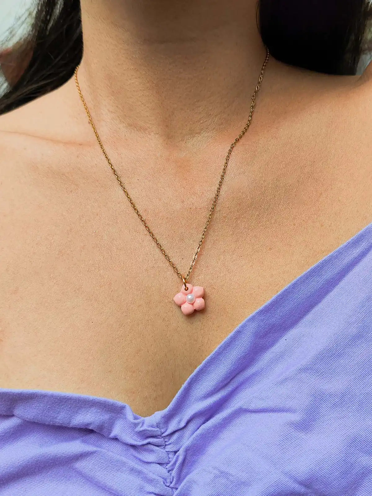 Un conjunto de aretes y collar con flores rosas en arcilla polimérica y perlas sintéticas. La delicadeza de cada pétalo resalta la feminidad y frescura, convirtiéndolo en el complemento ideal para realzar tu look con un toque romántico. Perfecto para quienes aman la naturaleza y la moda. Su cadena es acero inoxidable de 50 cm de largo.