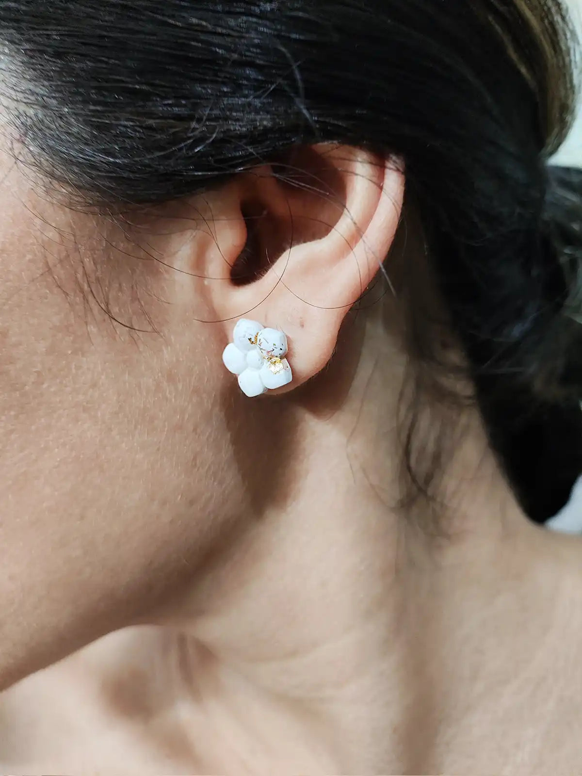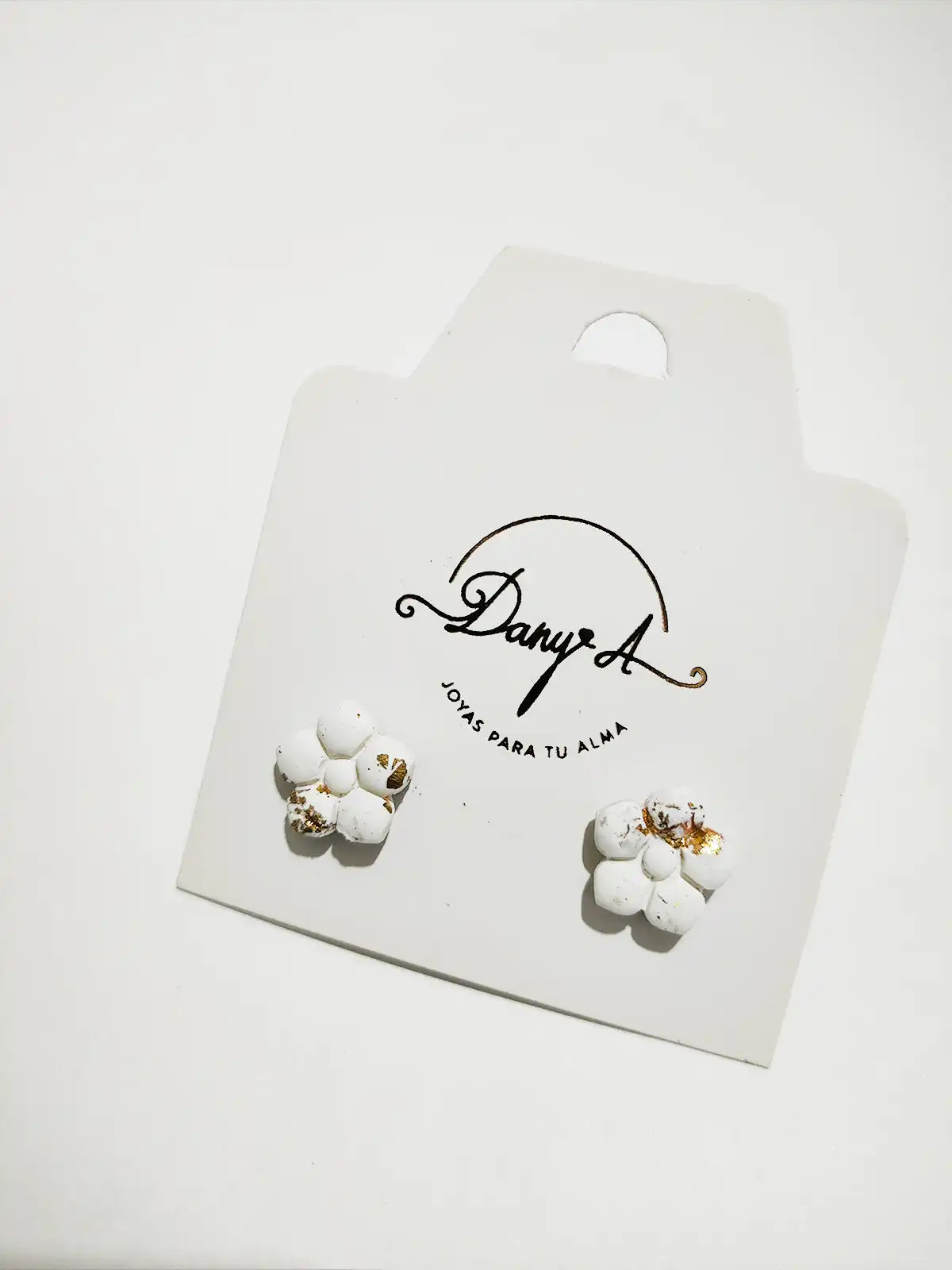 Dale un toque moderno y artesanal a tu estilo con estos pendientes en forma de flor color blanco y efecto marmolado, hechos en arcilla polimérica. Son ligeros, cómodos y súper versátiles, con detalles dorados que complementan cualquier outfit. Ya sea que los uses para el trabajo, una cena o una salida casual, siempre te verás elegante. Estos pendientes combinan lo chic con lo hecho a mano, ¡perfectos para cualquier ocasión!